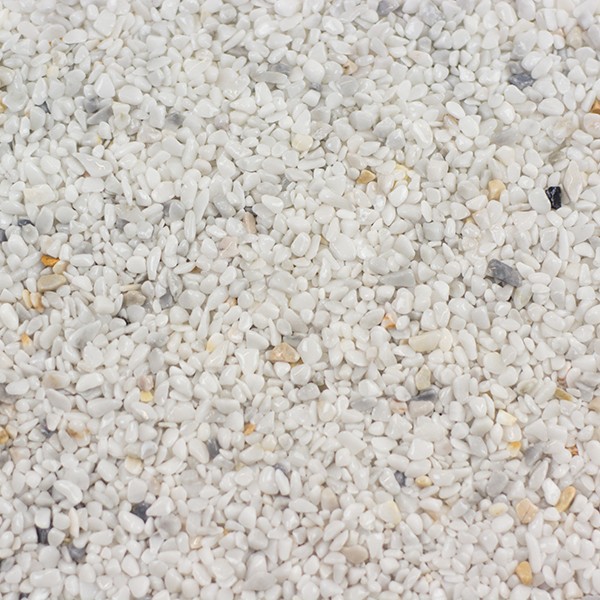 Graniglia decorativa superficiale di materiale marmoreo e colore bianco puro. Il materiale è completamente naturale, non è stato sottoposto a trattamenti di alcun genere e pertanto non rilascia sostanze dannose nel terreno. La denominazione del prodotto non ne implica la provenienza.